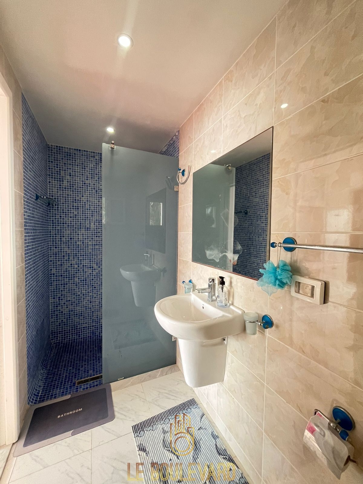 Au rez de chaussée on a un salon vu sur mer, 3 chambres à coucher, une cuisine bien équipée,