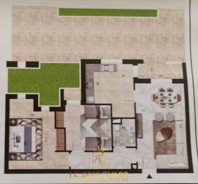 Il se compose d'un salon avec jardin, cuisine indépendante bien équipée (plaque, hotte, four, etc.), 2 chambres à coucher avec dressing, terrasse et une salle d’eau.