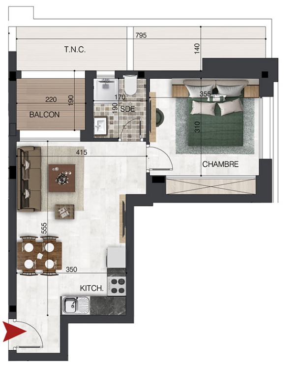Il se compose d'un salon avec un balcon vue sur mer, d'une kitchenette bien équipée (plaque, hotte, four, etc.), une chambre à coucher avec dressing et salle d’eau.