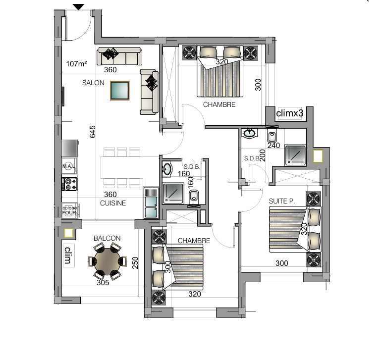 Il se compose d'un spacieux salon, d'une cuisine bien équipée (plaque, hotte, etc.) avec balcon, une suite parentale, 2 chambres à coucher avec dressing et salle d’eau.