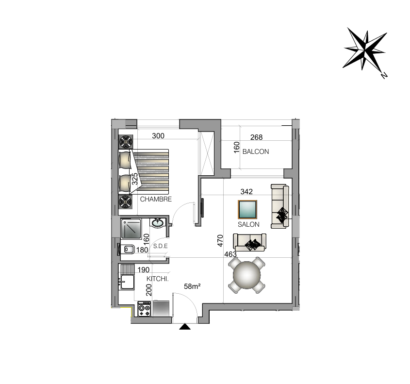 Il se compose d'un salon avec balcon, d'une kitchenette bien équipée (plaque, hotte, etc.), une chambre à coucher avec dressing et salle d’eau.