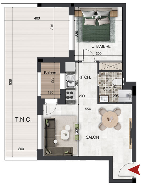 Un appartement S+1 avec terrasse situé dans une résidence en cours de construction à Sidi Mahersi, Nabeul – l’un des quartiers les plus chics et calmes de la ville.
