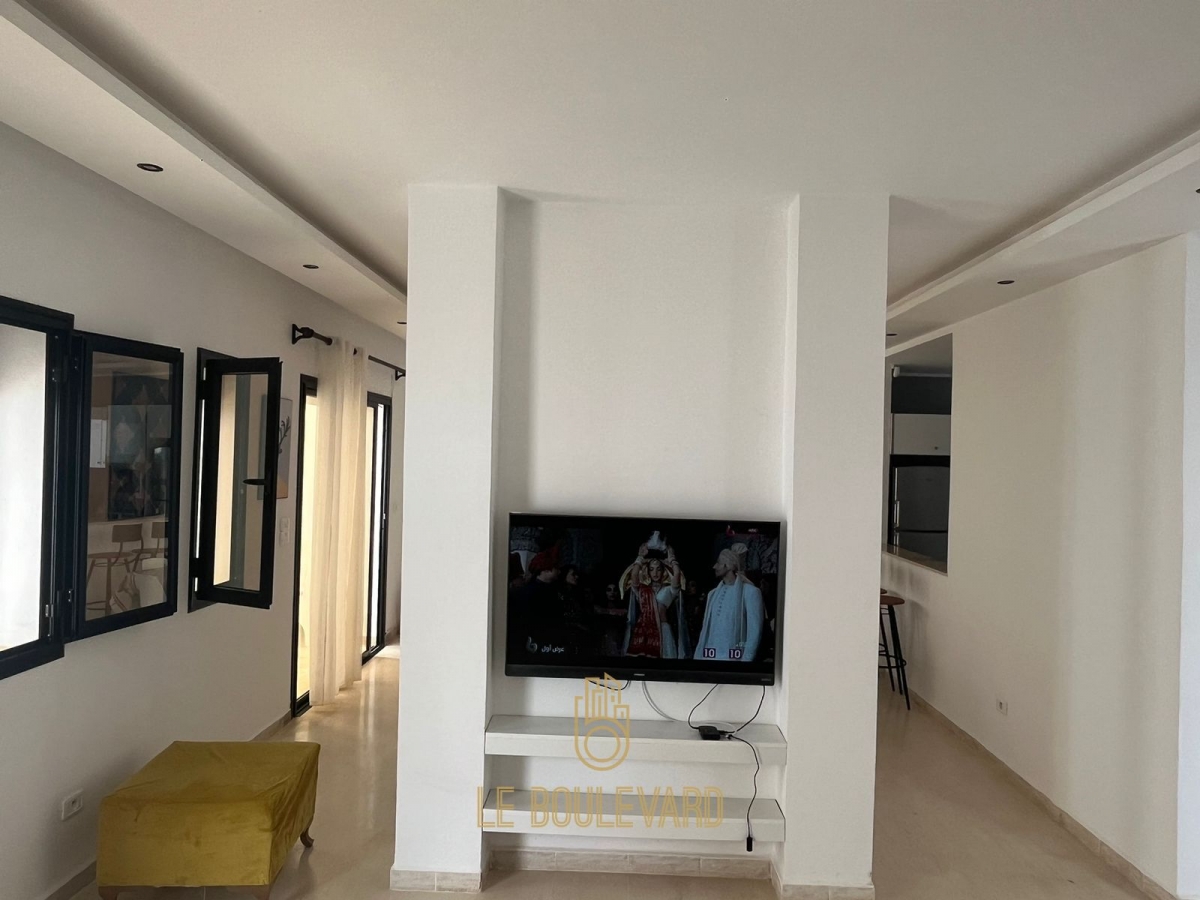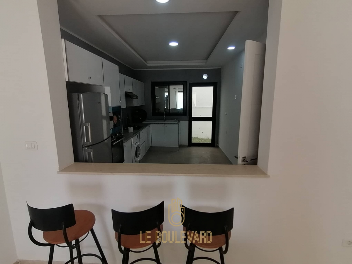Au rez de chaussée on a un salon lumineux donnant sur la piscine, salle à manger, une cuisine bien équipée (Plaque, hotte, micro-onde, machine à laver, réfrigérateur, cafetière …) et salle d’eau.