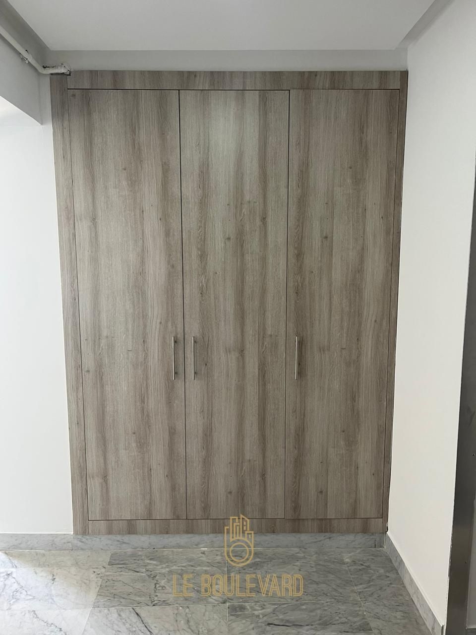 La porte d'entrée ouvre sur un salon spacieux et lumineux, il est revêtu en marbre blanc, la cuisine est bien équipée (plaque, hotte, four…) avec séchoir, 2 chambres à coucher qui se partagent une salle d’eau avec douche à l’italienne.