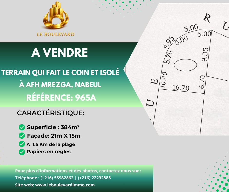 Un terrain qui fait le coin, situé à AFH Mrezge, cité El Wafa, Nabeul.