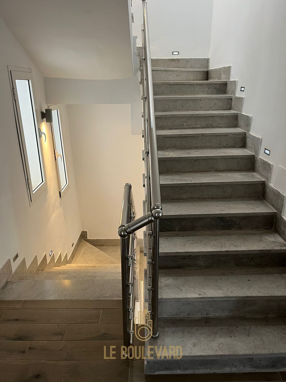 Au 1ér étage on trouve une suite parentale avec salle d’eau, dressing et balcon vue sur mer, 2 chambres à coucher avec terrasse et salle d’eau.