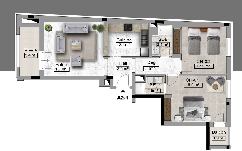 Il se compose d'un salon avec balcon, une cuisine indépendante et bien équipée (plaque, hotte, four, etc.) la partie nuit comprend une chambre parentale avec salle d’eau et balcon offrant une vue sur la piscine, ainsi qu'une chambre d'enfant, placard et une salle de bain.