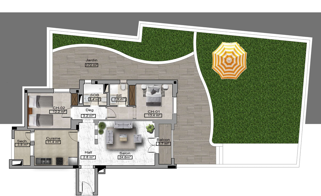 Il se compose d'un salon avec balcon, une cuisine indépendante et bien équipée (plaque, hotte, four, etc.) avec séchoir et grand jardin ; la partie nuit comprend une chambre parentale avec salle d’eau et dressing, ainsi qu'une chambre d'enfant, placard et une salle de bain.