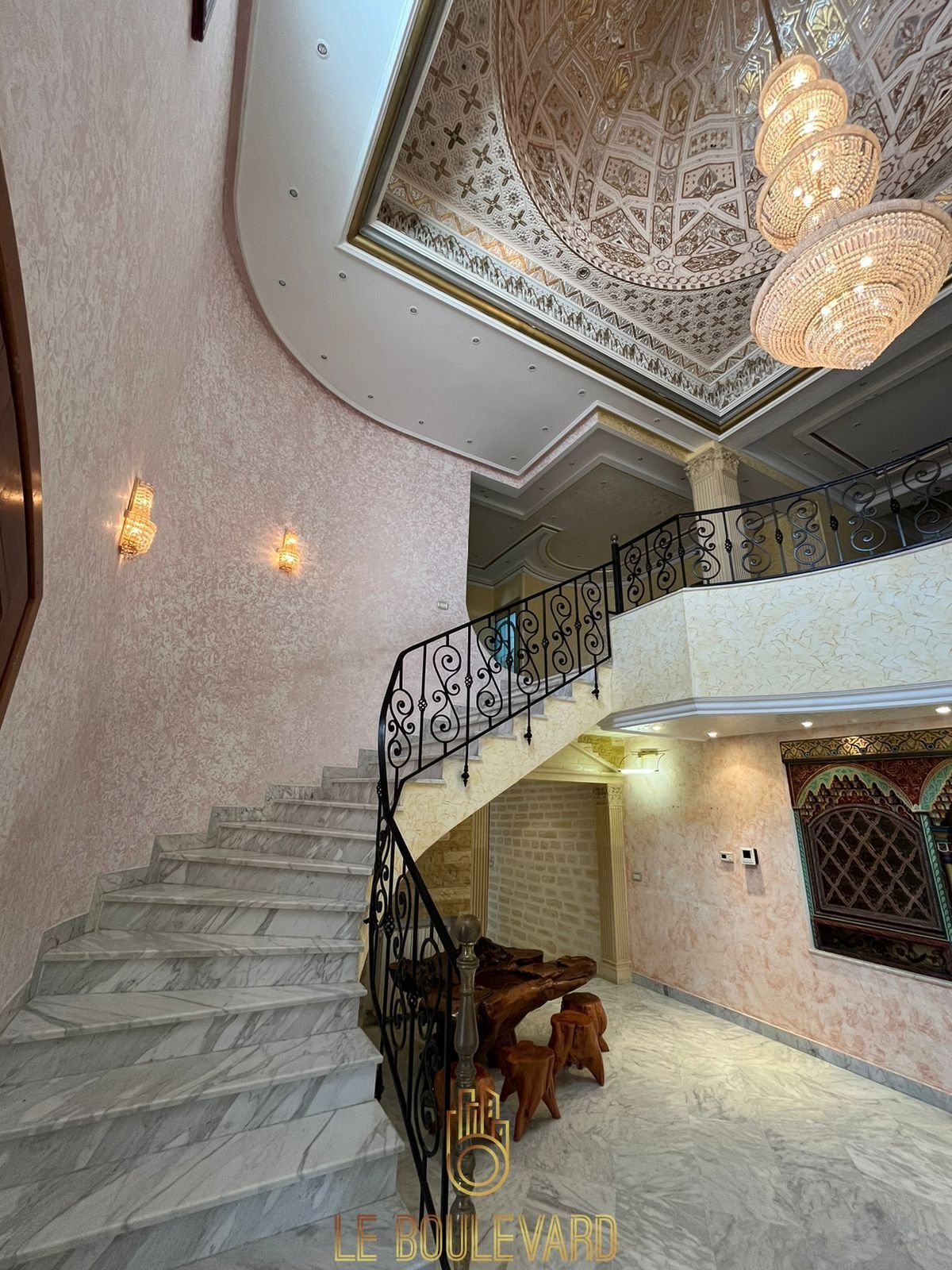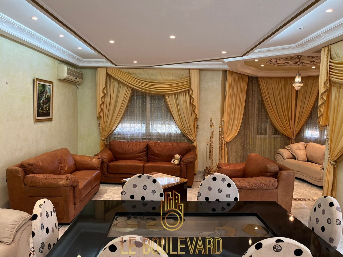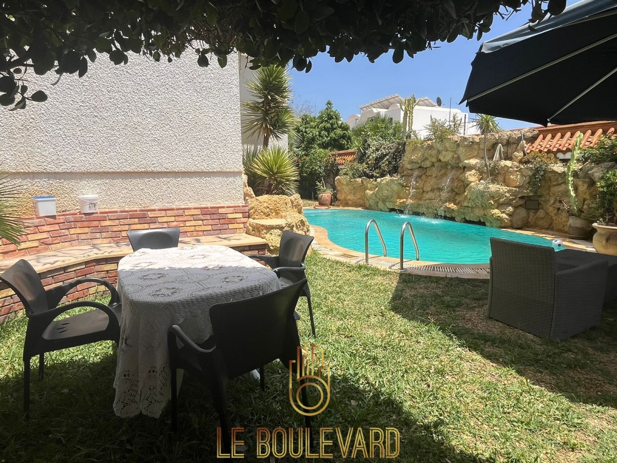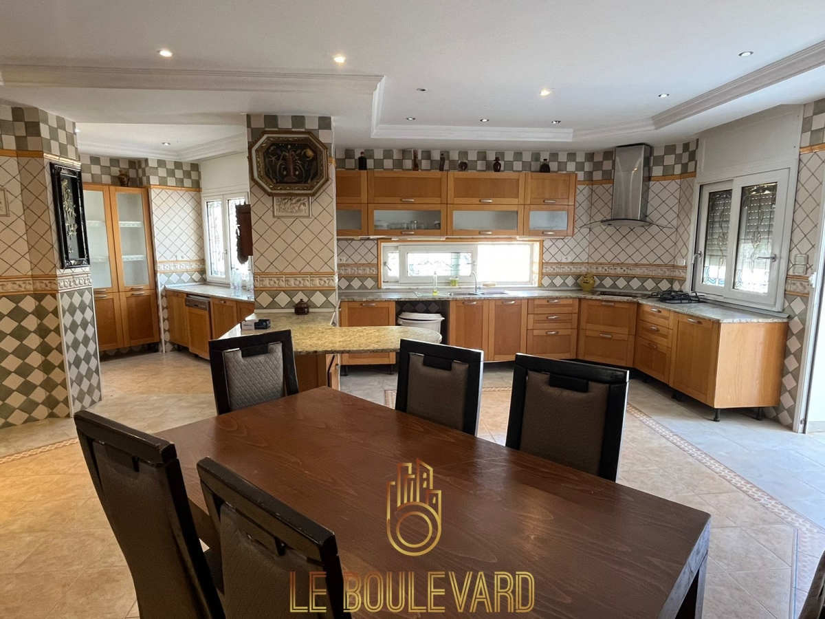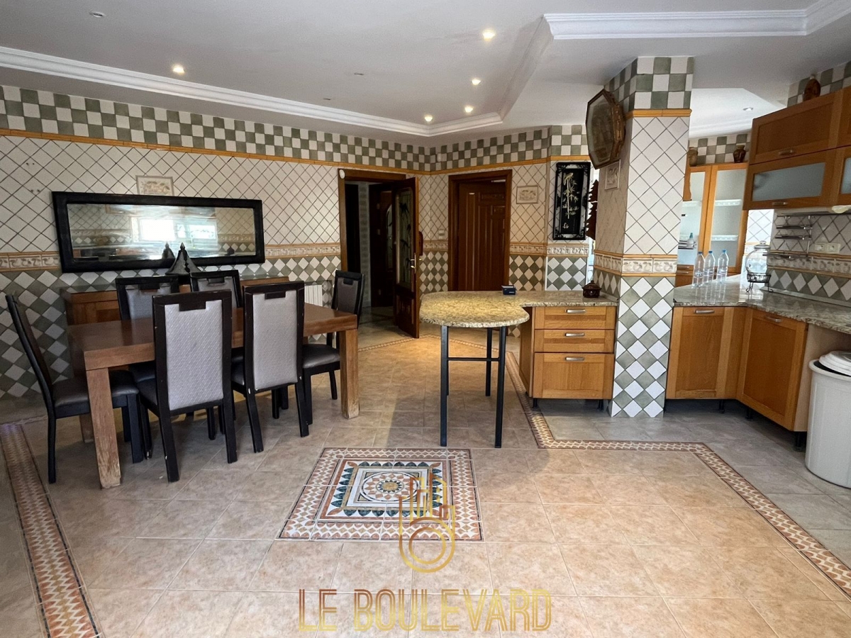 Au rez de chaussée on a un spacieux et lumineux salon avec terrasse donnant au la piscine, salle à manger, un séjour marocain, 2 chambres à coucher, salle d’eau et une spacieuse cuisine bien équipée avec terrasse.