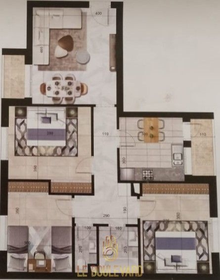 Il se compose d'un salon avec balcon, cuisine indépendante bien équipée (plaque, hotte, four, etc.), 2 chambres à coucher avec dressing et 2 salles d’eau.