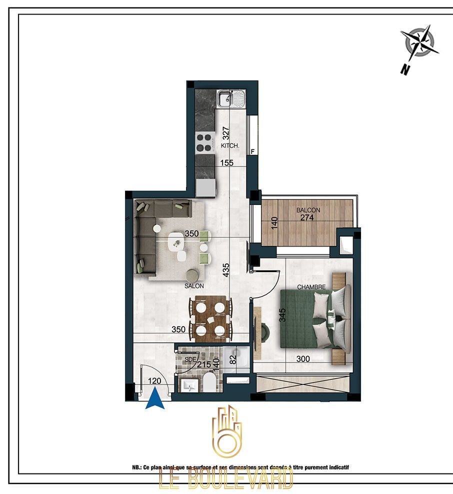 Il se compose d'un salon, Chambre à coucher, salle d’eau, balcon et d'une kitchenette bien équipée (plaque, hotte, etc.).