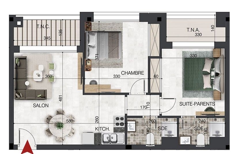 Un appartement S+2 au dernier étage, situé dans une résidence en cours de construction à Sidi Mahersi, Nabeul – l’un des quartiers les plus chics et calmes de la ville.