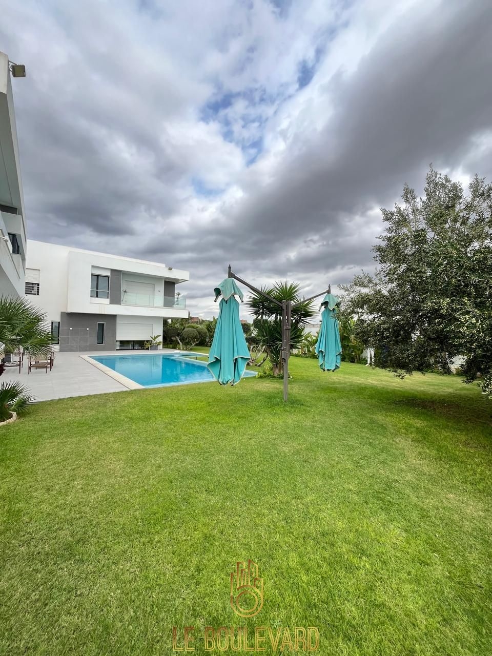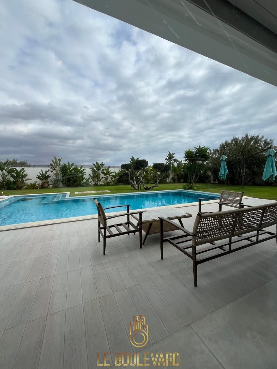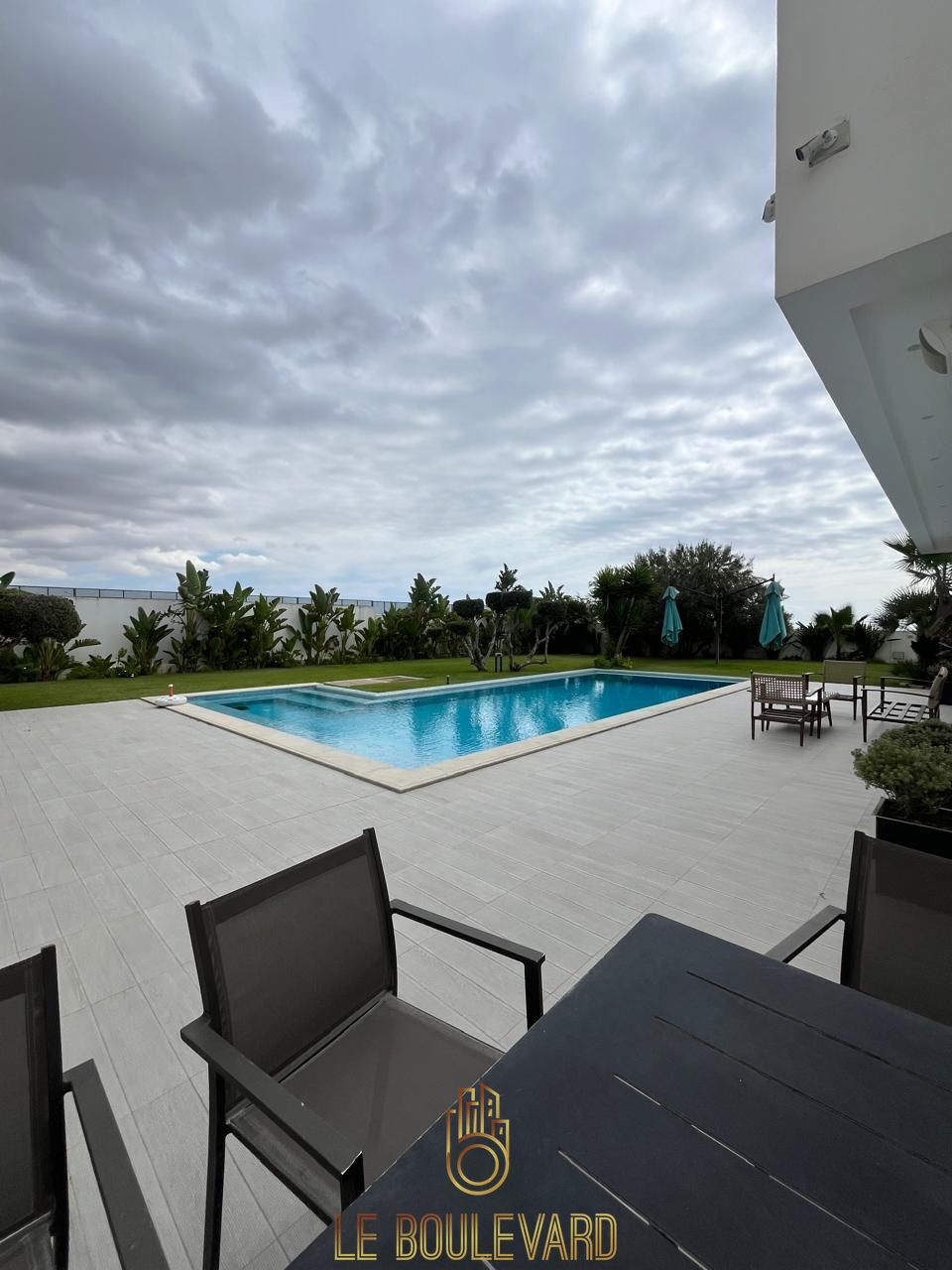 Une villa de maître S+6 avec piscine située à Mrezge – Nabeul, dans un quartier résidentiel de luxe entouré de villas haut de gamme.