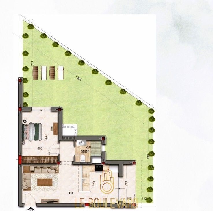 Il se compose d'un salon, Chambre à coucher, salle d’eau, balcon et d'une kitchenette bien équipée (plaque, hotte, etc.) et jardin