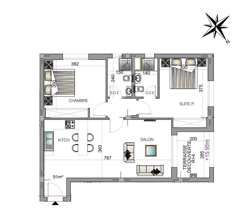 Il se compose d'un salon avec une terrasse, d'une cuisine bien équipée (plaque, hotte, etc.), une suite parentale, une chambre à coucher avec dressing et salle d’eau.