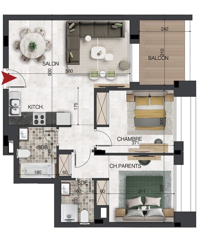 Il se compose d'un salon avec balcon vue mer, d'une cuisine bien équipée (plaque, hotte, four, etc.), d’une suite parentale avec dressing et salle d’eau ; une chambre à coucher avec dressing et salle de bain.