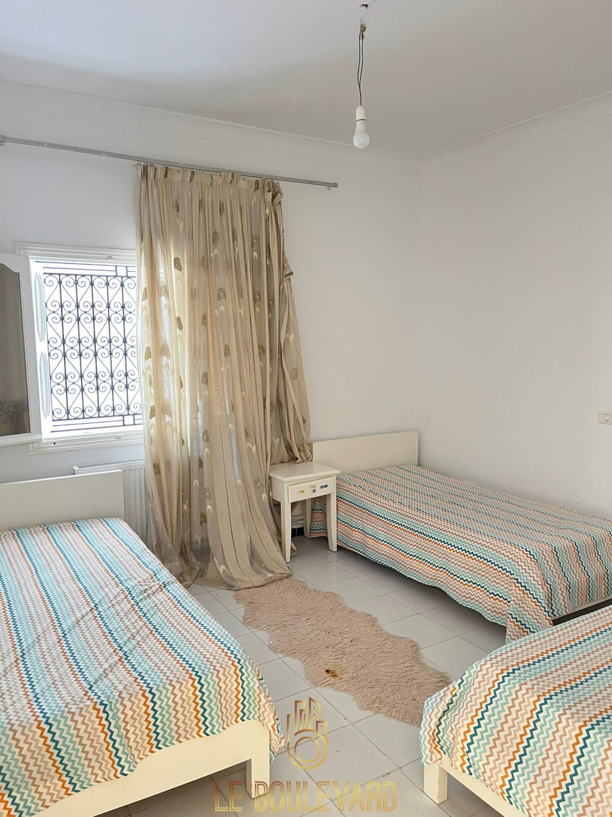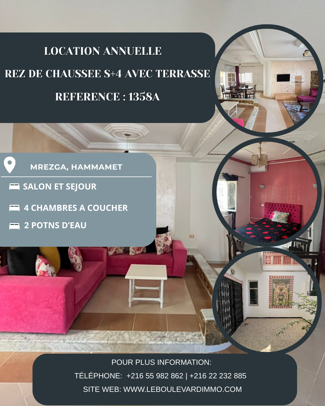 Rez-de-chaussée S+4 avec terrasse, meublé ou vide, situé à Mrezge, Hammamet.