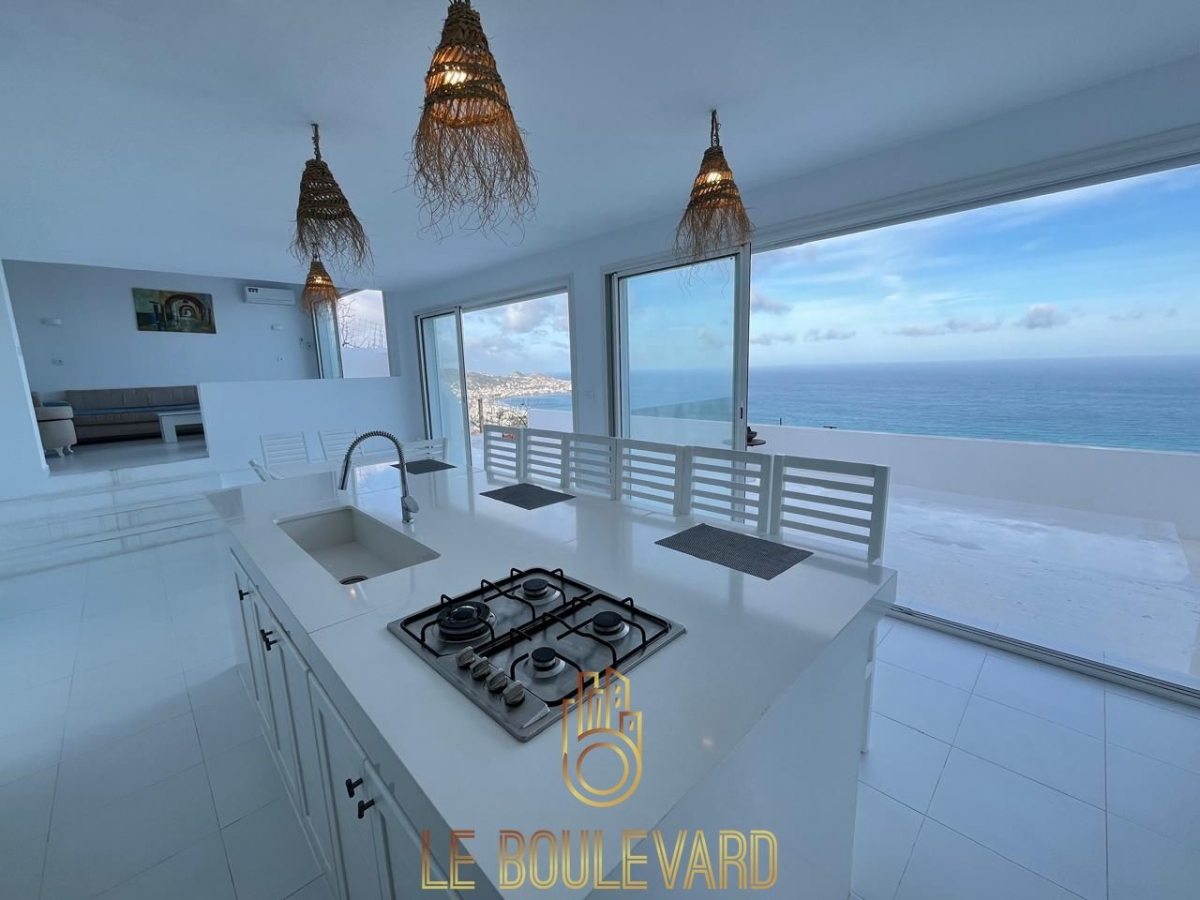 Dès l’entrée, vous découvrirez un salon lumineux, bénéficiant d’une vue dégagée sur la mer et les montagnes, créant une atmosphère de détente absolue.