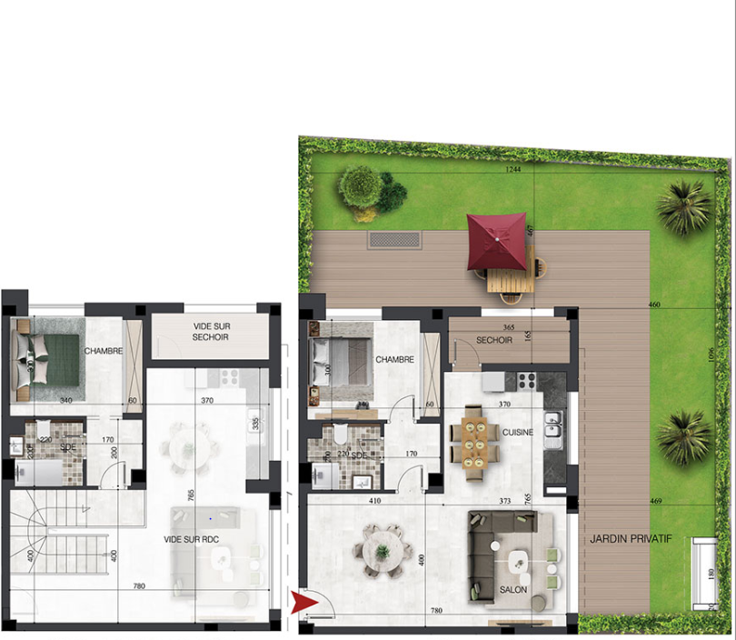 Duplex S+2 avec jardin au bord de la mer, situé dans une résidence en cours de construction à Sidi Mahersi, Nabeul – l’un des quartiers les plus chics et calmes de la ville.