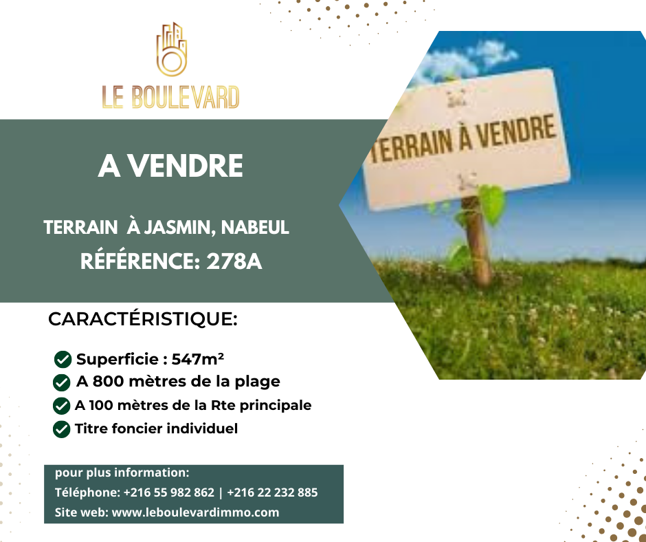 Un terrain viabilisé situé à Jasmin, Nabeul, derrière clinique Amen.