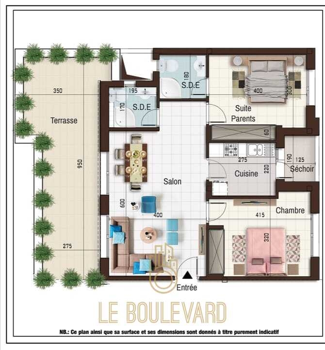 Il se compose d'un spacieux salon avec terrasse vue mer, salle d’eau, une chambre à coucher avec dressing, une suite parentale avec dressing et salle d’eau, une cuisine indépendante bien équipée avec séchoir vue piscine.