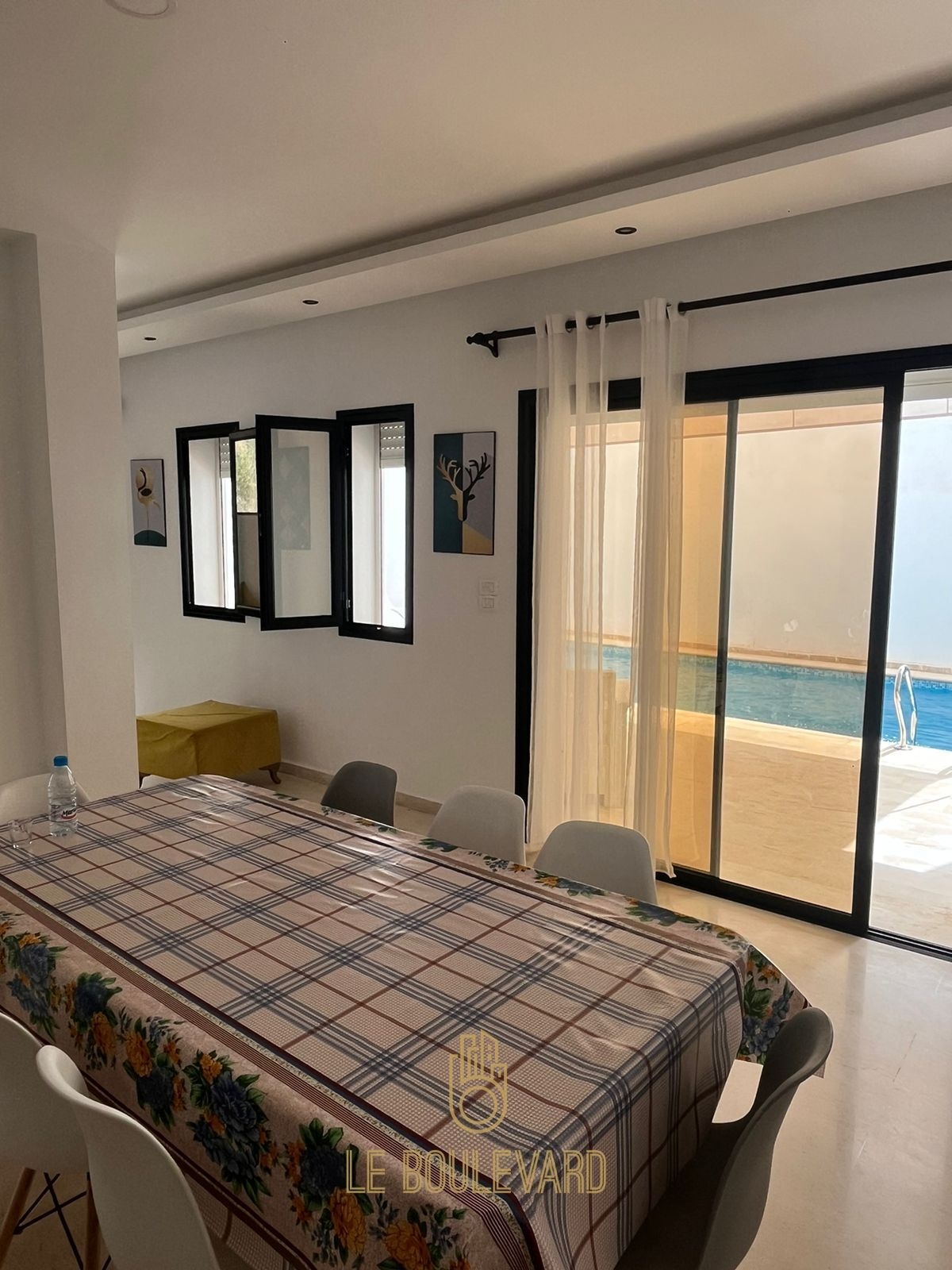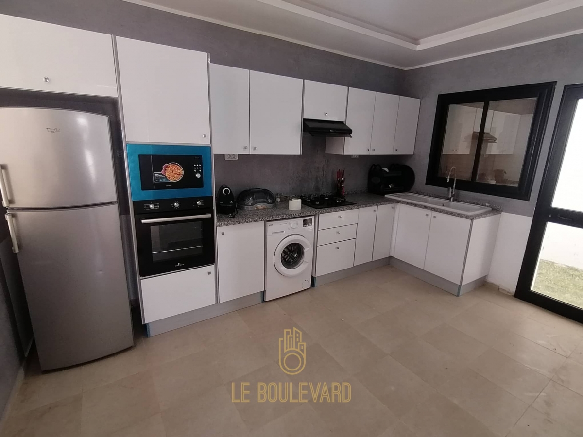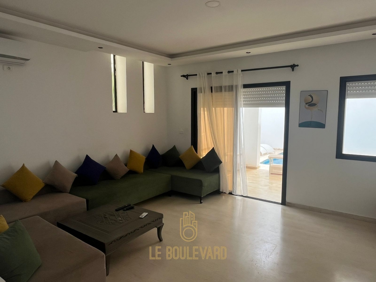 Au rez de chaussée on a un salon lumineux donnant sur la piscine, salle à manger, une cuisine bien équipée (Plaque, hotte, micro-onde, machine à laver, réfrigérateur, cafetière …) et salle d’eau.