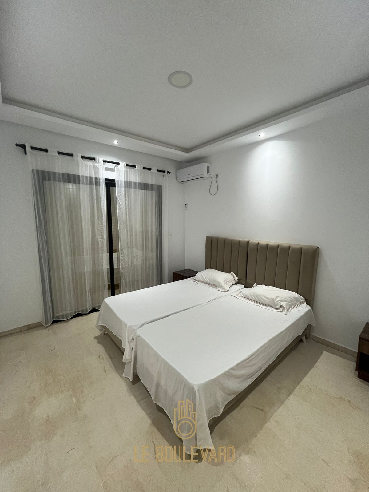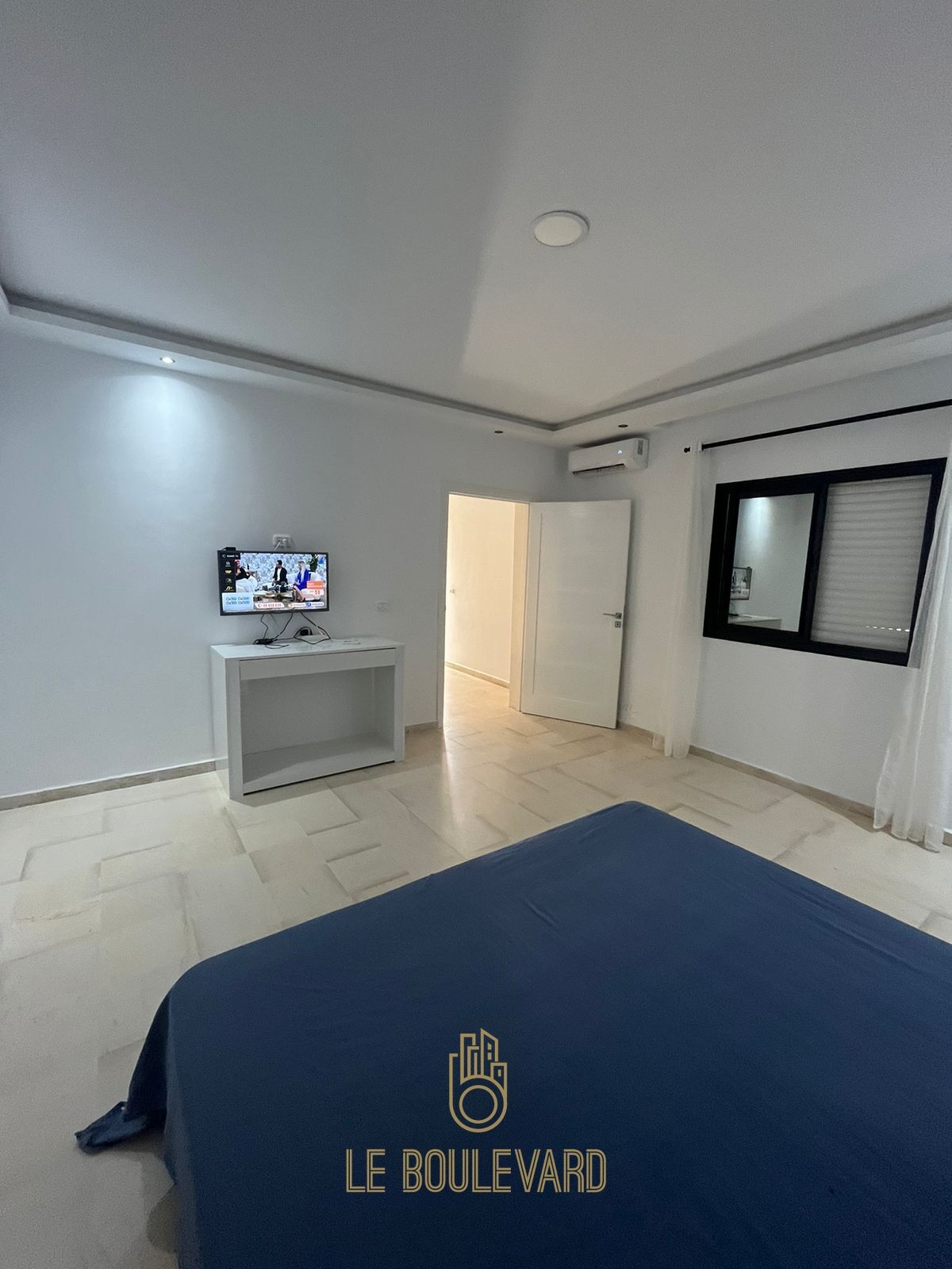 Au 2éme étage on a une spacieuse chambre avec lit double, dressing, télévision et une grande terrasse vue sur mer