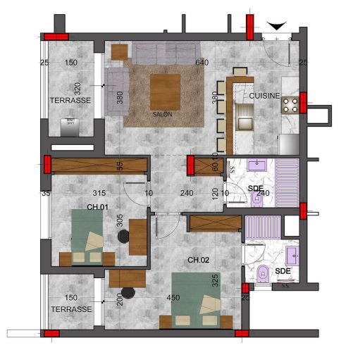 Il se compose d'un salon avec terrasse, une suite parentale avec son propre salle d’eau, balcon et dressing, une chambre à couche avec dressing, une cuisine bien équipée (Plaque, hotte, four…), et salle d'eau.
