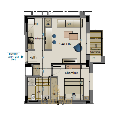 Il se compose d'un salon avec balcon, une chambre à coucher avec dressing, placard, une cuisine bien équipée (plaque, hotte, four…) et salle d'eau avec cabine de douche.