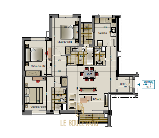 Il se compose d'un salon avec terrasse, salle à manger, une suite parentale avec sa propre salle d’eau et dressing, 2 chambres à coucher avec dressing, une cuisine bien équipée (plaque, hotte, four…) avec séchoir et salle de bain.