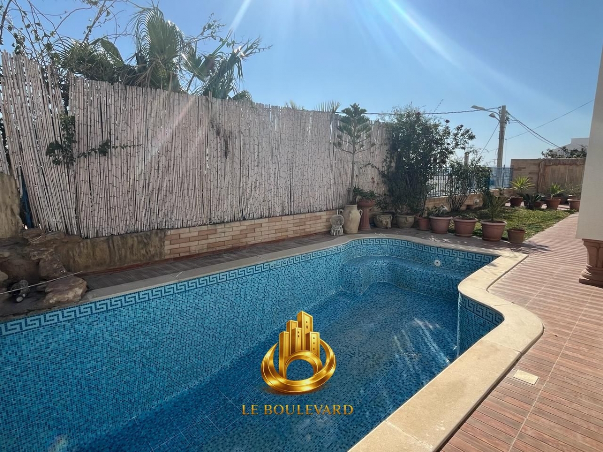 Une villa S+4 avec piscine et vue sur mer, située à Hammamet Nord, dans un quartier calme et recherché.