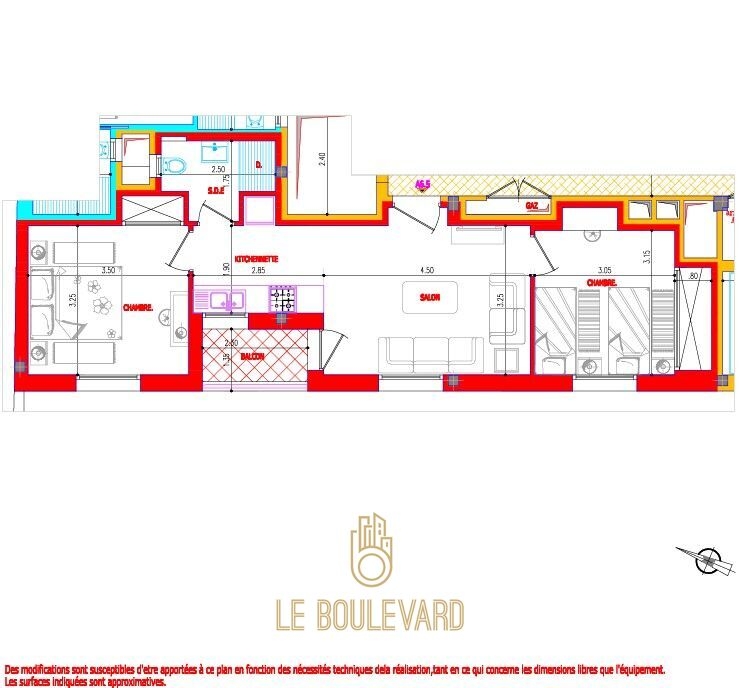 Il se compose d'un salon avec balcon, 2 chambres à coucher avec dressing, une kitchenette bien équipée (plaque, hotte, four…) et salle d'eau.