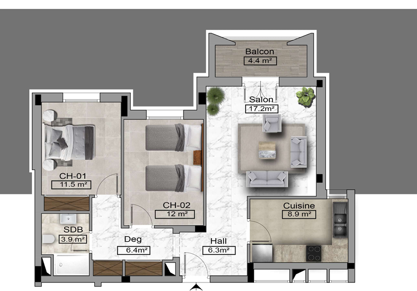 Il se compose d'un salon avec balcon, 2 chambres à coucher avec dressing, une cuisine indépendante et bien équipée (plaque, hotte, four, etc.) Et salle de bain.